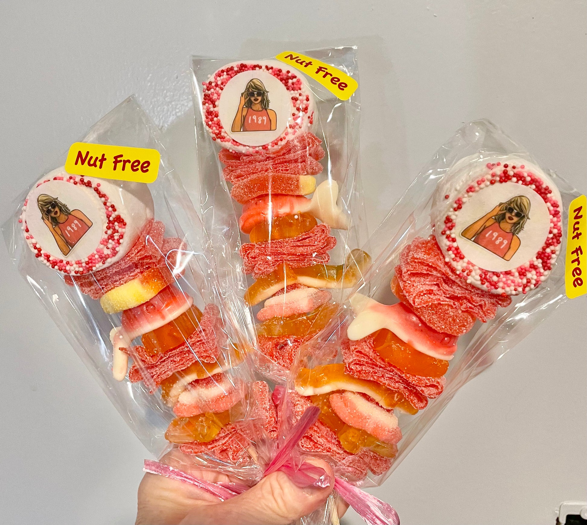 A Candy Kebob is a fun way to celebrate any occasion, choose any color or logo of your choice. Has a variety of popular gummy candies and is topped with a marshmallow.