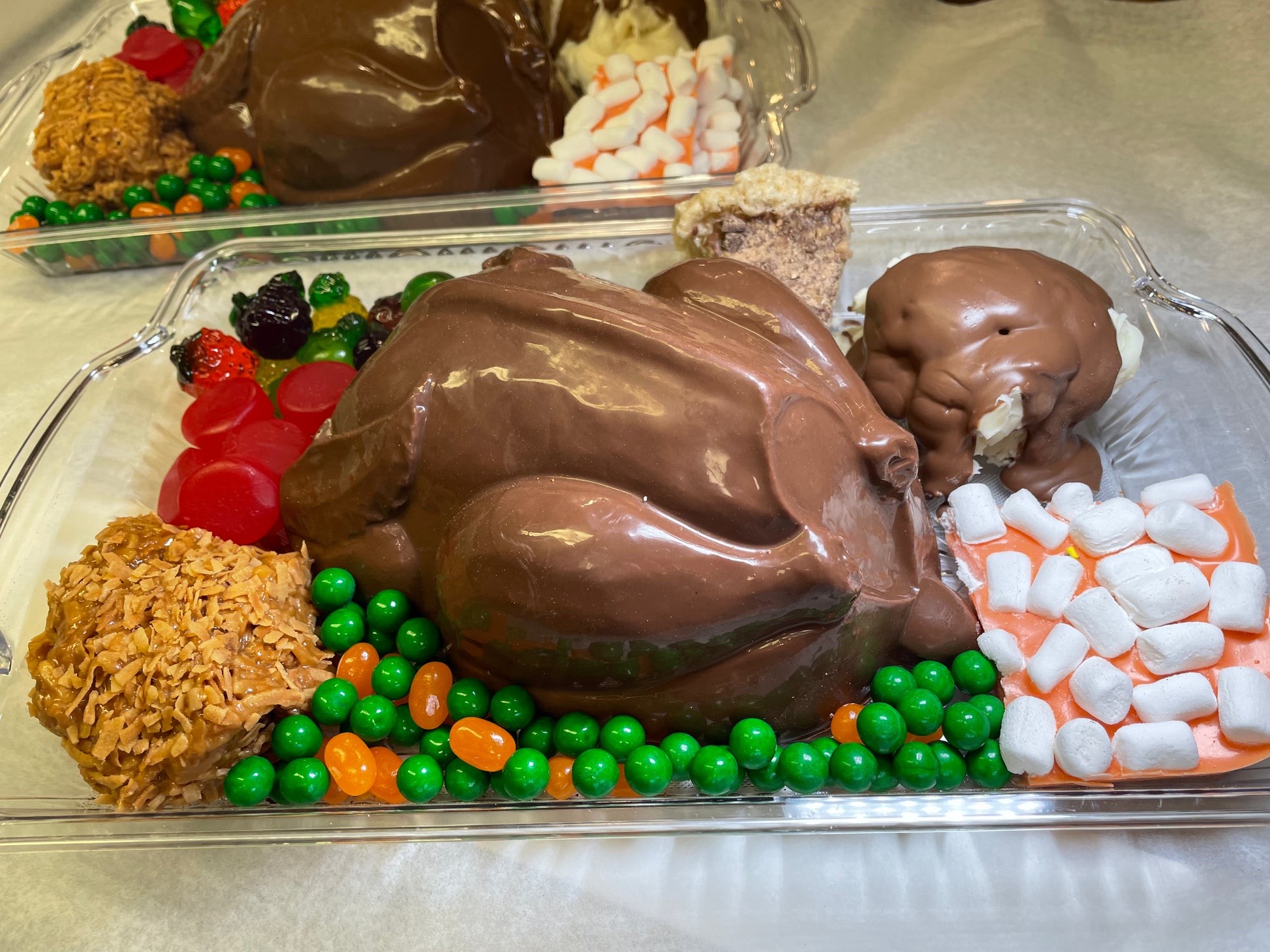 Our famous chocolate & candy turkey dinner is a delightful conversation starter and a whimsical way to enjoy the flavors of Thanksgiving in a unique form. Whether you're displaying it as a table centerpiece or giving it as a gift, it's sure to bring a smile to everyone's face and make your Thanksgiving celebration even more memorable.