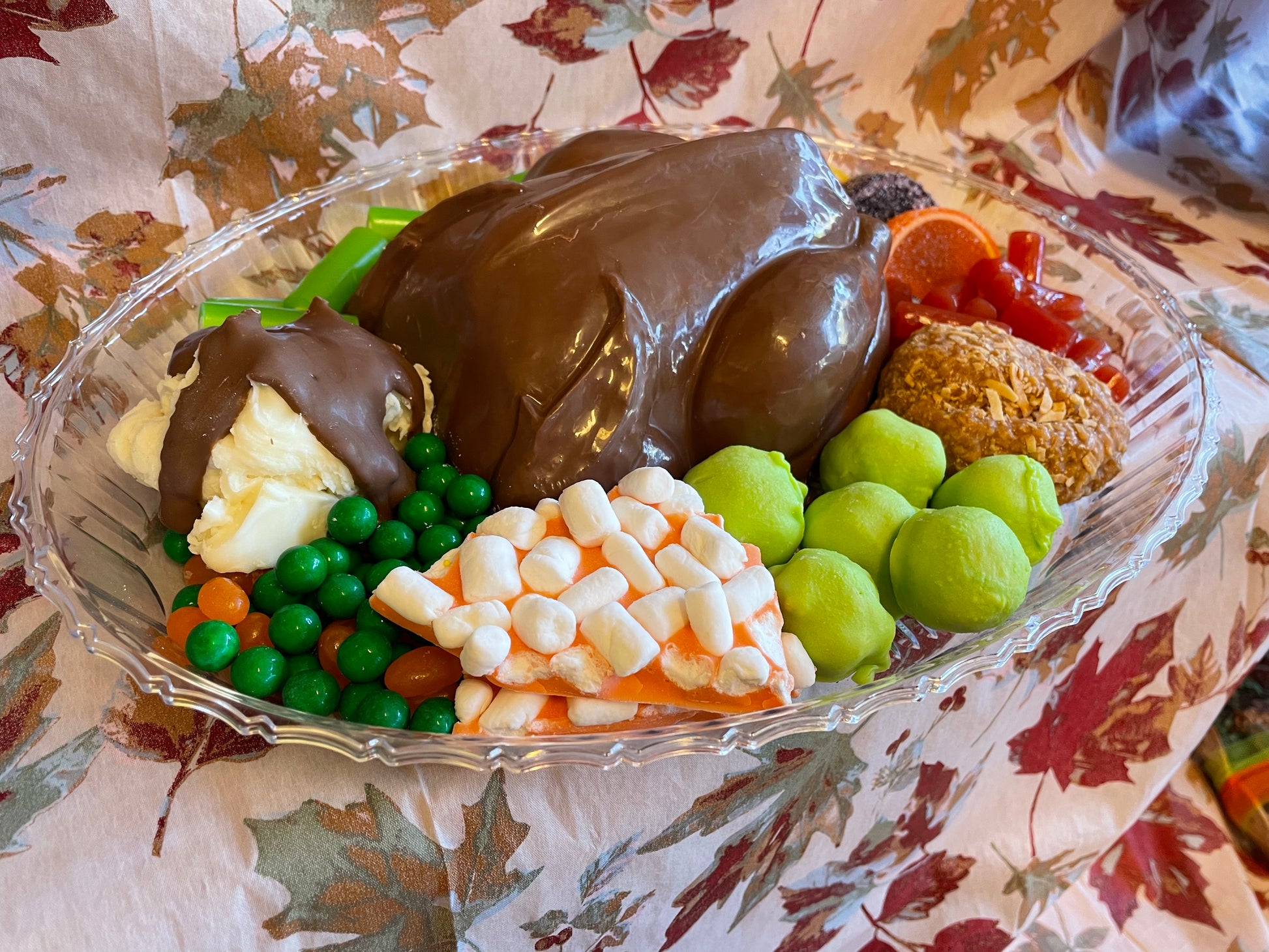 Our turkey dinners include a chocolate roasted Turkey stuffed with a surprise stuffing, peas (candy covered chocolate), carrots (Jelly Bellies), green beans (sour apple candy straws), brussel sprouts (rice krispie treats) and a fun play on mashed potatoes with gravy, sweet potatoes topped with marshmallows, stuffing (coconut & caramel), cranberries and fruit for dessert!