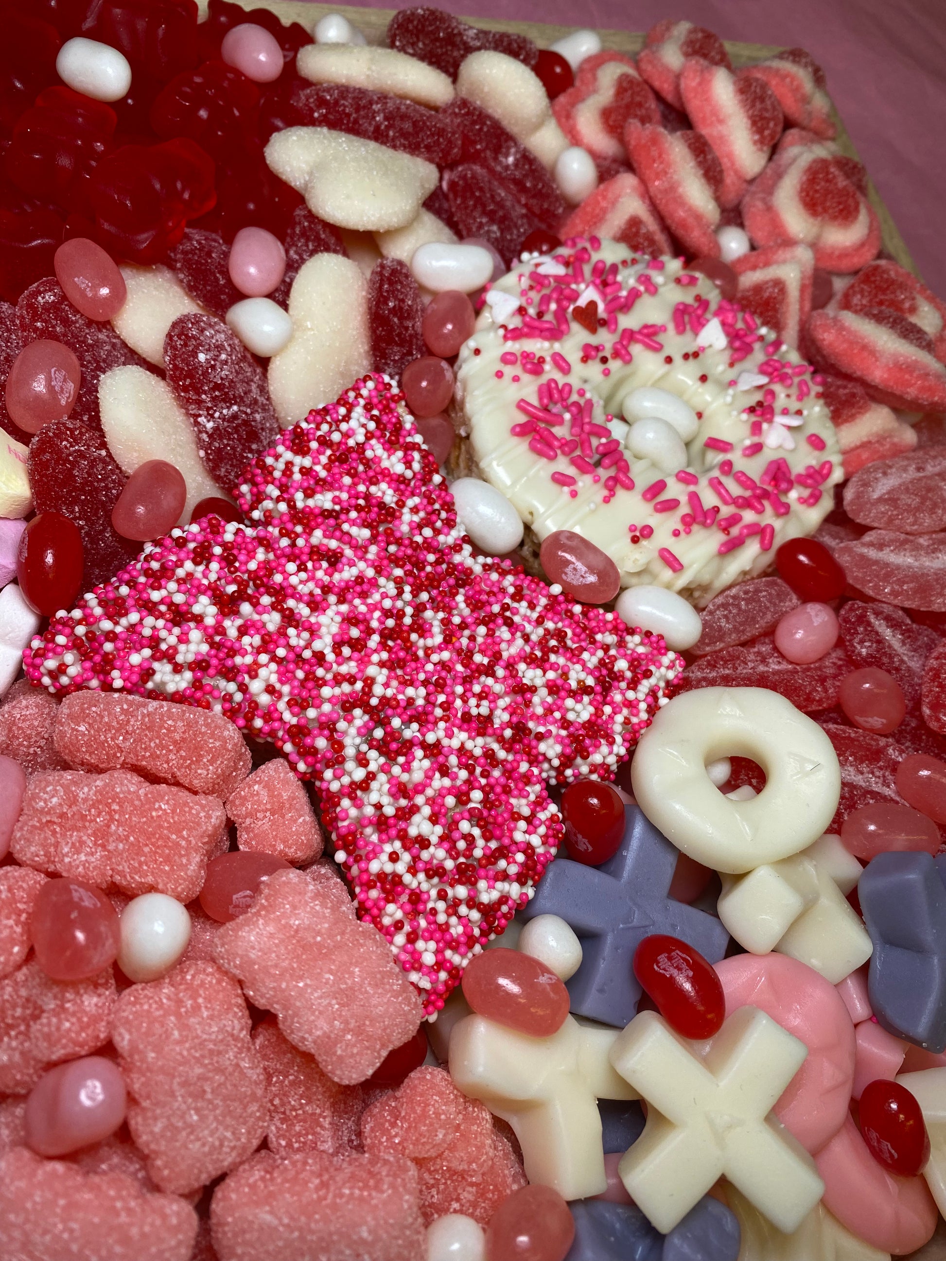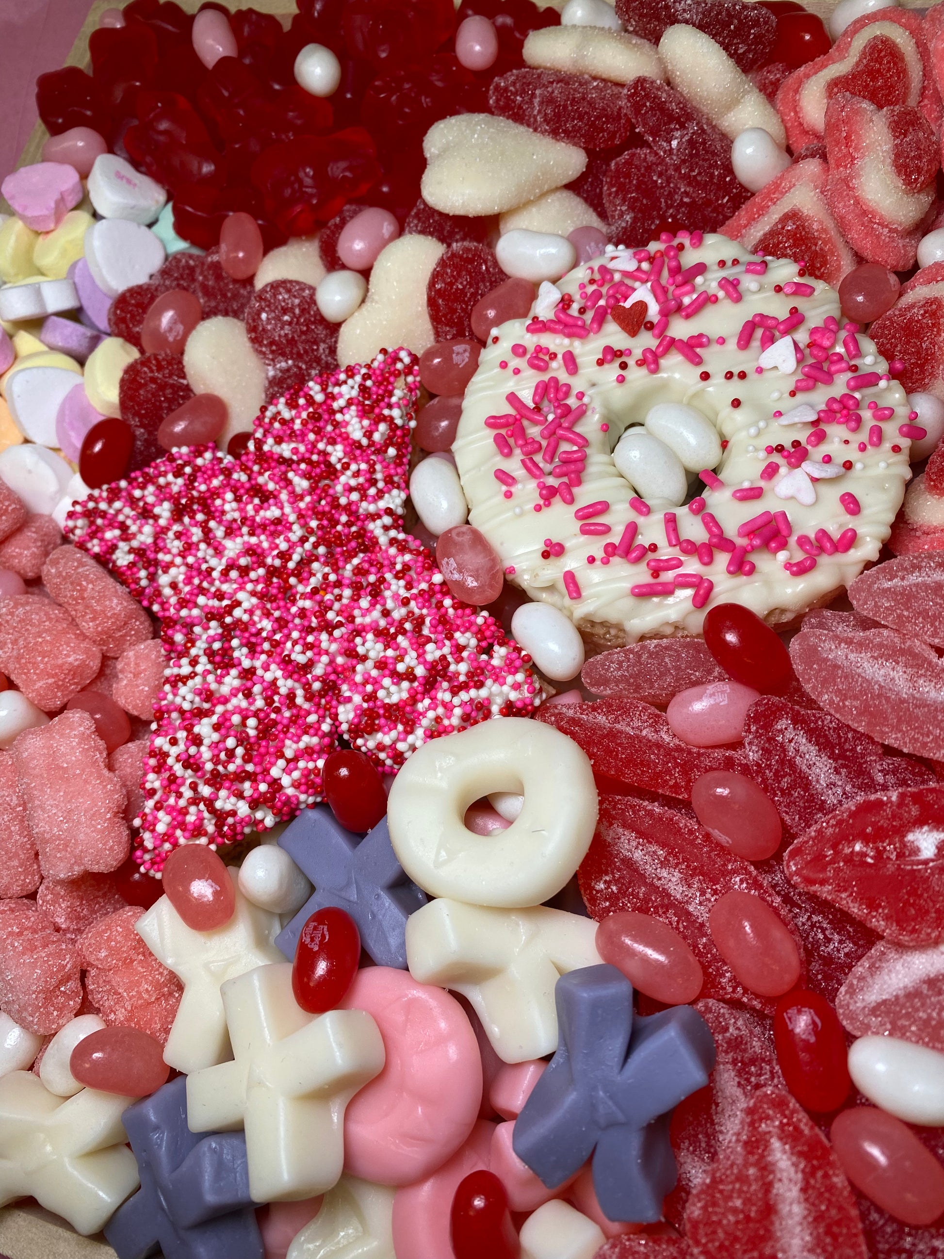 Show your love this Valentine’s Day with our Hugs ‘n Kisses Candyboard. Our Valentine charcuterie board is filled with a variety of delicious gummies and accented with sweet XO Rice Krispie treats. This gift is perfect for the candy lover in your life.