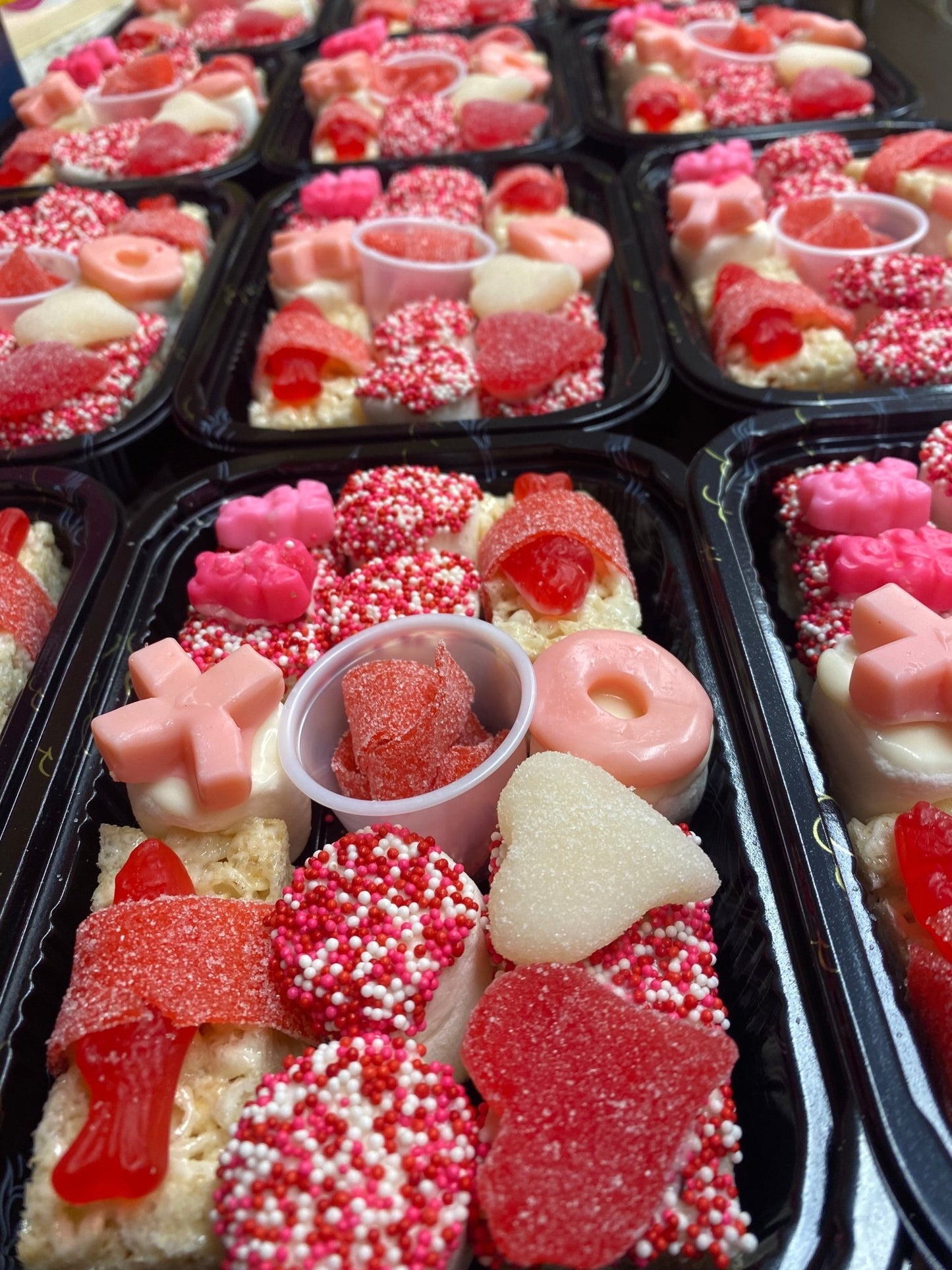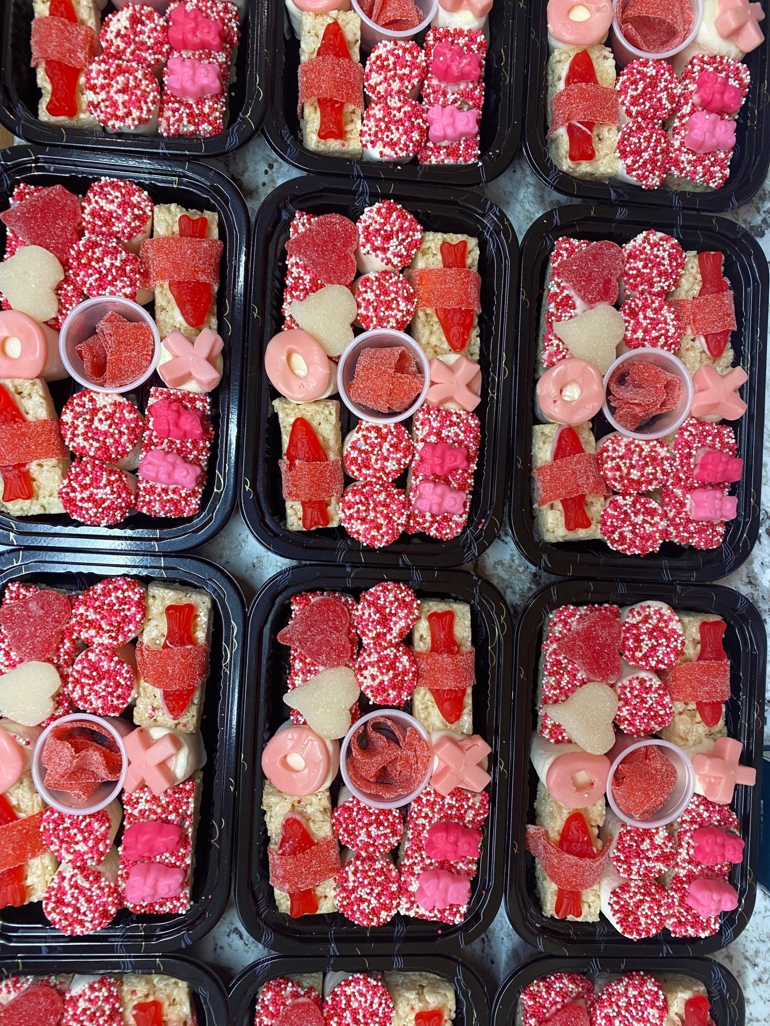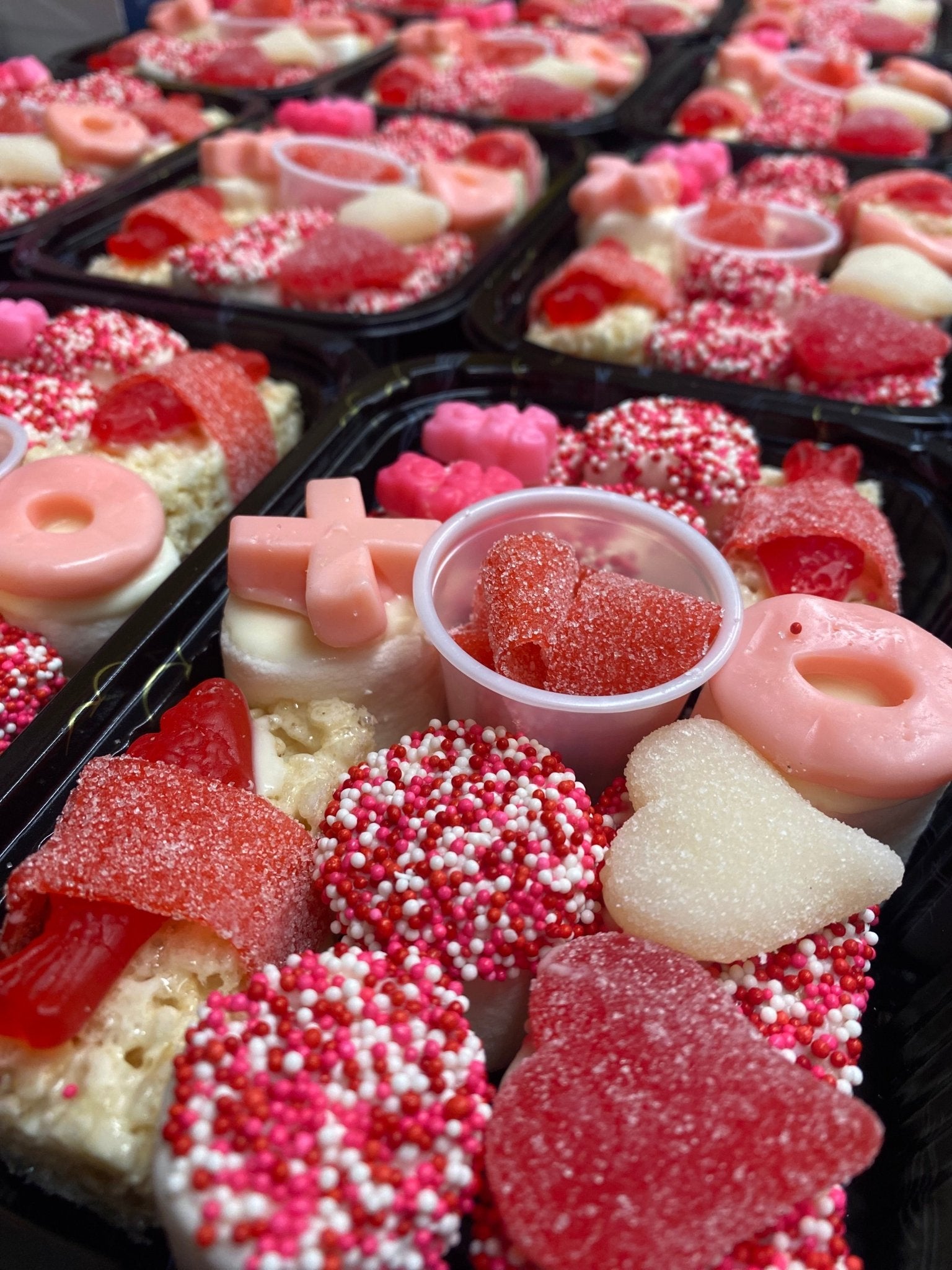 Candy Sushi is one of our MOST POPULAR products we offer. Now you can celebrate Valentine’s Day with a candy sushi meal! Always a fun treat for everyone! A mixture of Rice Krispie Treats, Marshmallows, Candies & Gummies are all put together to mimick your favorite sushi platters and the best part is the trays are topped with chopsticks to make eating super fun!