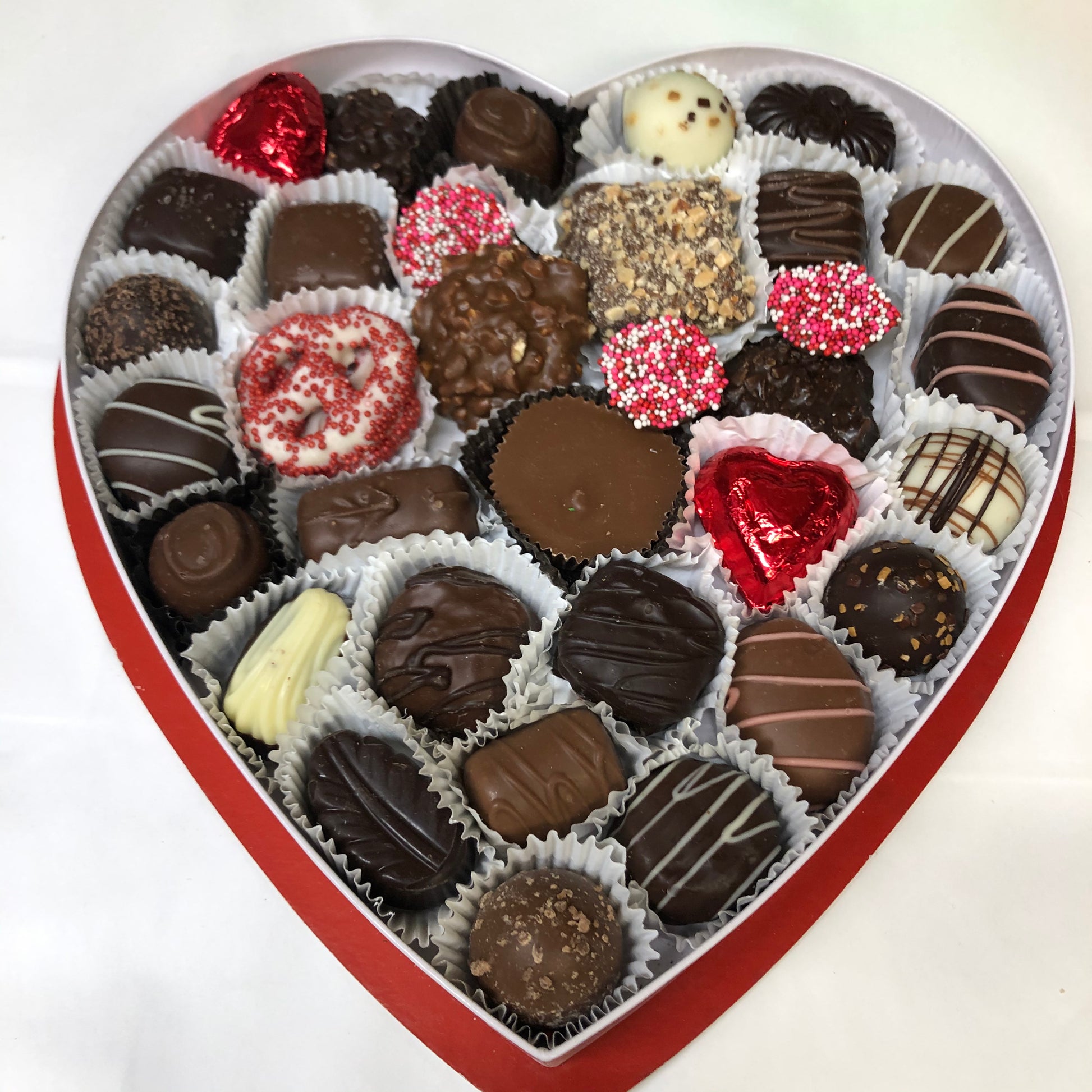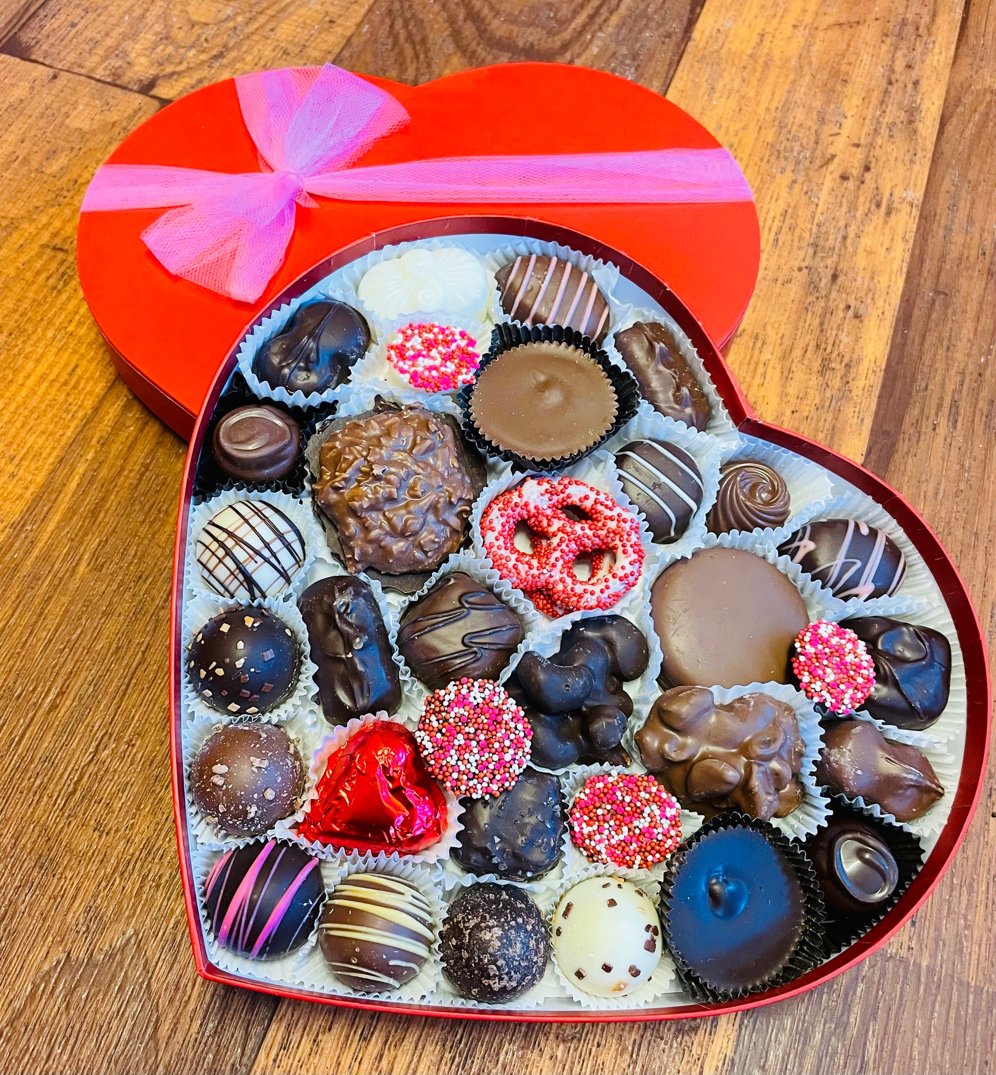 Celebrate Valentine's Day with our 1lb or 1/2lb heart filled with a delectable selection of gourmet chocolates. These hearts are filled in our store with a combination of truffles, clusters, caramels and many more handmade chocolate. Made with love, our Valentine's Heart is sure to please any chocolate lover. Share the love and sweetness with your special someone.