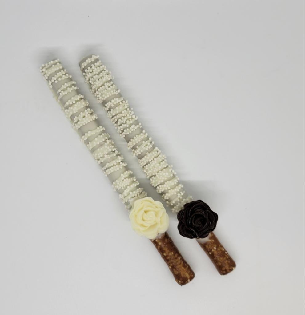 These elegant Pretzel Rods offer the perfect mix of salty and sweet. Perfect for a wedding, engagement or anniversary. Each pretzel rod is hand-dipped and decorated by our expert chocolatiers. Celebrate with these delicious treats!